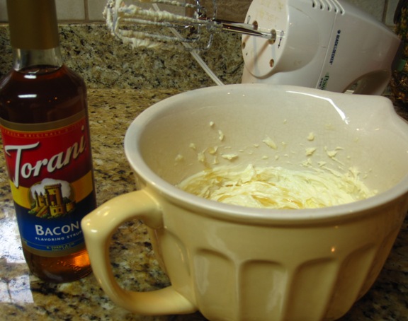 I found this bacon flavored syrup at World Market and had to have a bottle. I knew Tim would find it interesting, too. Then I had to come up with something to make with it. Bacon is an ever popular flavor and very trendy in sweets these days so I decided to make a bacon icing to use on the cupcakes.