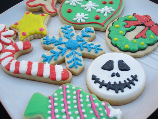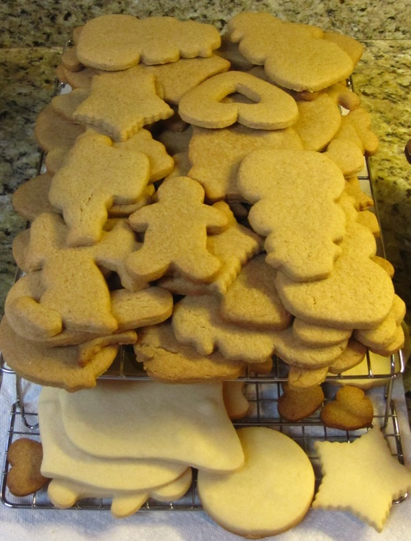 This year I have scaled back my holiday baking since many people in my world just are not eating a lot of that sweet stuff these days. No one wants tight jeans. Tim and I chose to make some simple cut-out cookies instead. Of course, I turned a simple batch of cut out cookies into making SEVERAL flavors of dough plus icing in a zillion colors. Then we spent most of an entire day rolling out, cutting out, baking and decorating 11 dozen cookies. My husband is a cookie champ. (True story.) It was a nice festive way to spend the day with each other.