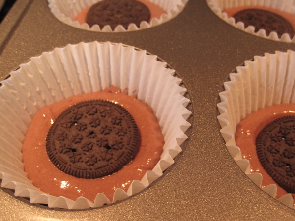 Line your large muffin tins with large cupcake wrappers. Place a small spoonful of batter in each wrapper. Add a whole cookie. Spoon a small amount of batter in on top of each cookie and add a second cookie. Fill the tins up with batter. About 2/3 full.