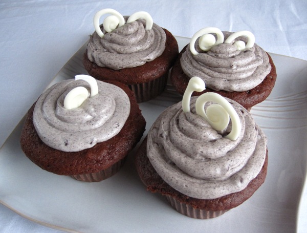 These cupcakes have 2 sandwich cookies (Oreos or similar) hidden in each one. Yes, two. Overkill is the best, isn’t it? Did I mention these are not diet? They are made in the BIG muffin tins. If you use a regular size muffin pan you will only be able to stuff one cookie inside. That would be sad.