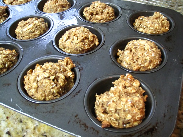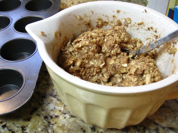 Pour the butter mixture over the oat mixture and stir it in gently. Add the eggs and stir until it makes a wet dough. Fill your muffin cups with the dough. It will make about 12 oatcakes.