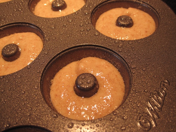 Make it easier on yourself by spooning the mixture into a plastic bag and snipping off one corner to pipe the filling into the greased donut pan. (I used non stick spray)