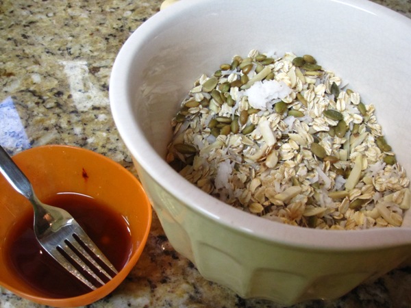 Stir the honey mixture into the oat mixture until everything is completely coated.