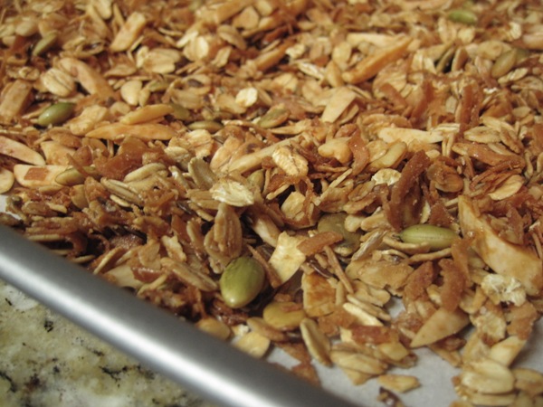 Pour the mixture onto a parchment lined baking sheet. Bake for 1 hour and 15 minutes. Stir every 15 minutes. Allow to cool and store in an airtight container.