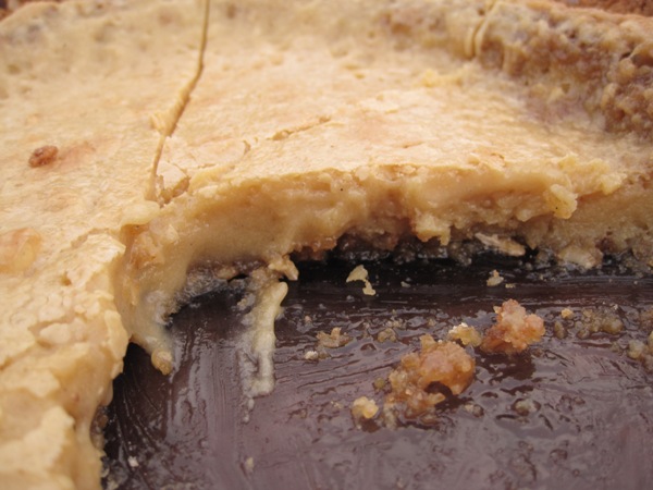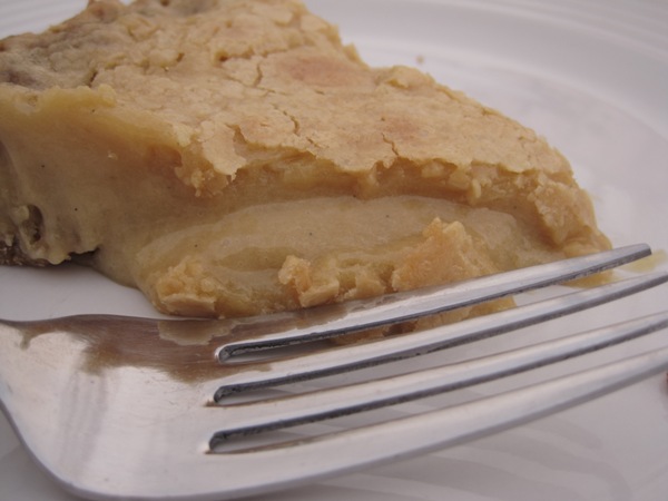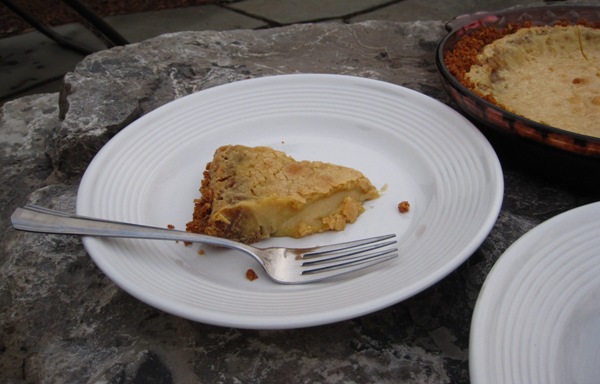 We make book club a potluck event. Of course. Friday night we had an awesome dinner that consisted of a beautiful green salad, a veggie tray, spanakopita, Mediterranean pasta salad, fruit salsa with cinnamon chips, lentil and cauliflower curry, crusty bread, wine, assorted cookies and this pie. Now I am hungry! It was all so good.