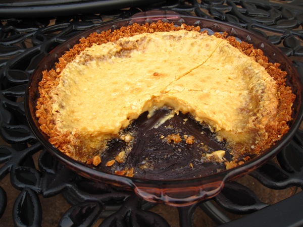 It’s simple to make. 😉 First you make the cookie for the cookie crust. After that bakes and cools you crumble it to make the cookie crust of the pie. Then you make the filling and bake the pie. After it cools a bit you have to refrigerate it for several hours to make sure it sets. It is meant to be eaten cold. If it starts to warm up too much it starts to ooze out of the crust.