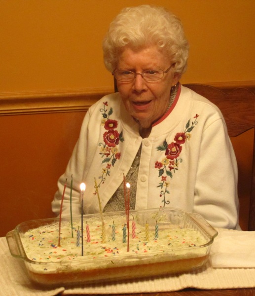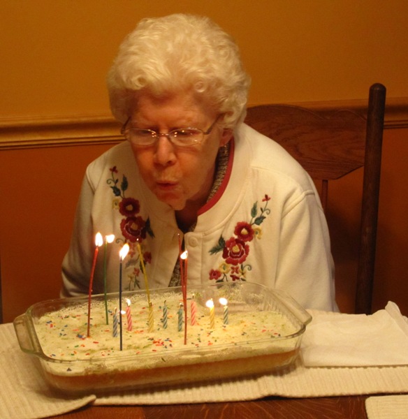 This is Grandma blowing out the candles. (1 candle for each decade to 80 and then 1 each year after. . so really she’s only 14!) I hope she kept her spit to herself. My secret fear of birthday cakes is spit. . .especially kid parties. . .ewww. You know you fear the spit, too. Don’t act like you don’t think it.