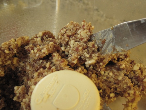 Put the dates in a food processor and wiz them up for a minute. Add the almonds and pulse until a crumbly paste forms.