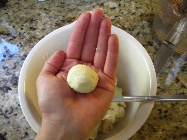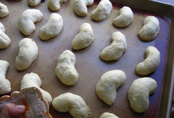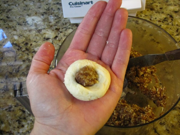 These are simple cookies. Just make the dough and the filling and to assemble you just take a ball of dough, press a small dent into the center, add a pinch of the filling and then roll to seal the filling inside. Make the dough ball into the shape of a crescent and place on a baking sheet.