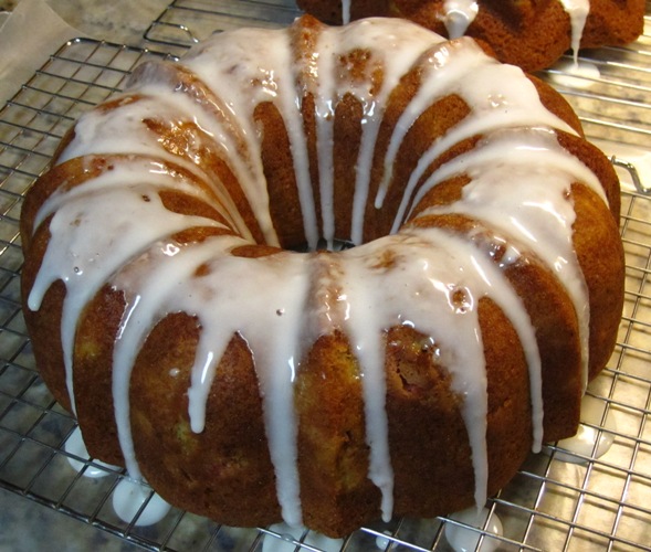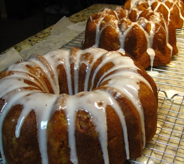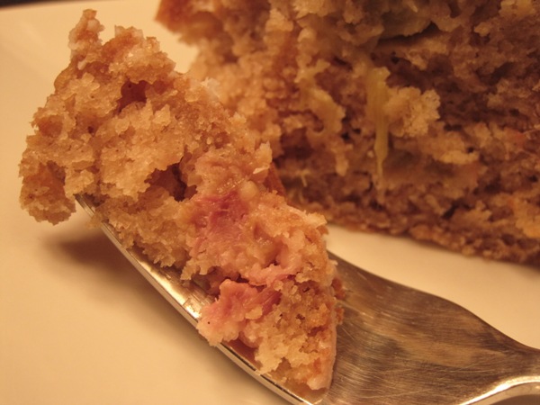 This cake is moist and delicious. The rhubarb adds the perfect tart little bite. And the lemon in the glaze really complements perfectly.