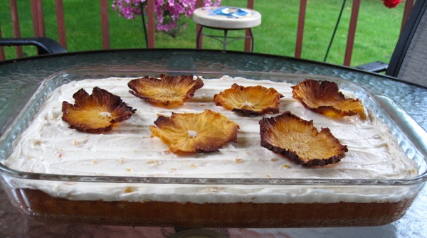 I made it in a 9 x 13 because I wanted to soak it with an orange syrup before I frosted it. It was nice and moist and orangy. Yes, orangy. . it’s a word in my world.