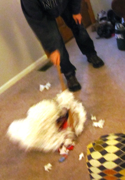 After the kids all took their turns clubbing the seal, it was Tim’s turn. His first hit was so hard and direct that it ripped the rope out of the paper maiche and he ended up actually clubbing it on the floor until it bled red candy.