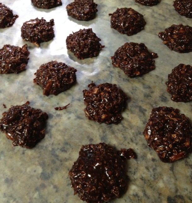 Line your counter or a large tray with wax paper. Drop by Tbsp on the wax paper. Allow to cool completely before you try to remove them. They will set up as they cool. Store in an airtight container. Makes 30-36 cookies.