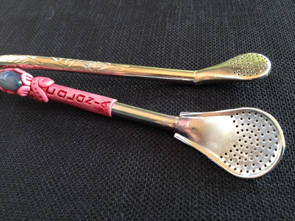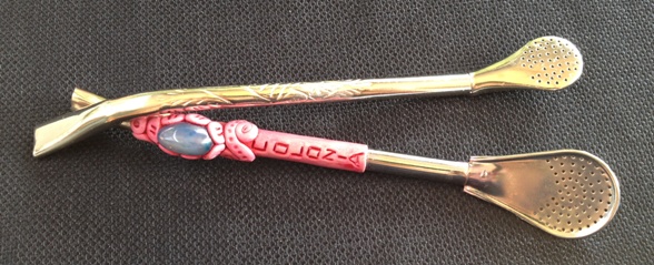 Since J was in my part of the US, (He’s a world traveler these days) he brought me my surprise package in person! All kinds of awesome stuff but these stood out.  They are from his travels in South America. He got them in Uruguay. They are straws called bomba or bombilla that are used to drink a ground herbal tea-type concoction popular in South America. They act as a sieve to prevent you from drinking the loose leaves.
