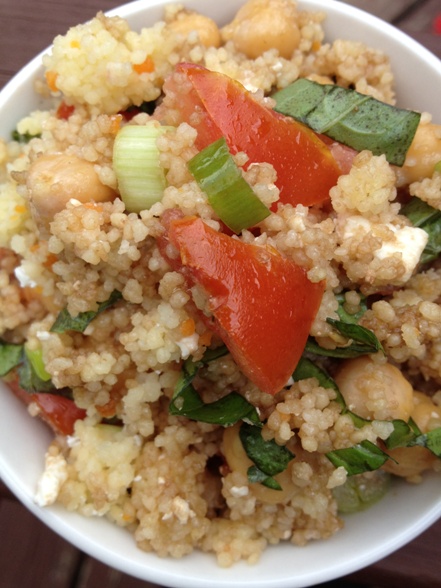 Once the couscous has absorbed all the water, fluff it with a fork. Stir in the chick peas, feta, tomato, basil, green onions.