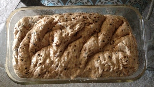 After 6 hours, scrape the dough into a loaf pan sprayed with non stick spray. Let the loaf pan rise for another hour.  The dough will rise up over the top of the pan.