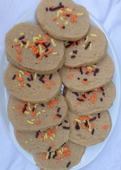When ready to bake, remove the dough from fridge and slice into 1/4″ slices. Place slices on a parchment lines baking tray. Bake 350 degrees for 10-12 minutes.