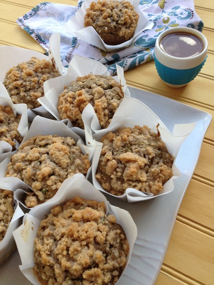 Spoon batter into a muffin tin lined with cupcake wrappers. Fill muffin cups 2/3 full. Sprinkle a Tbsp or so of streusel topping onto each muffin. Bake at 350 degrees for 20 minutes. Makes 12-18 regular size muffins or 6-8 large size muffins.