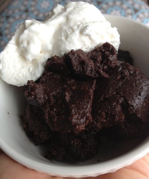 I imagine this would be great with a little scoop of ice cream. Vanilla by tradition or chocolate if you, like me, don’t believe in too much of a good thing. I had no ice cream. Disappointing. But I did have Cool Whip so I made do. If you have an aversion to Cool Whip (I have no such aversion) whipped cream would also be tasty. I generally can’t be bothered to whip cream though. Plus it’s mean.