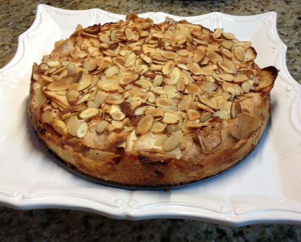 Bake at a 400 degree oven for 30 minutes. Remove from oven and sprinkle the top with the sliced almonds. Bake 15 minutes more. Cool. Remove outside ring from spring form pan and cut into slices to serve. Serves 8.