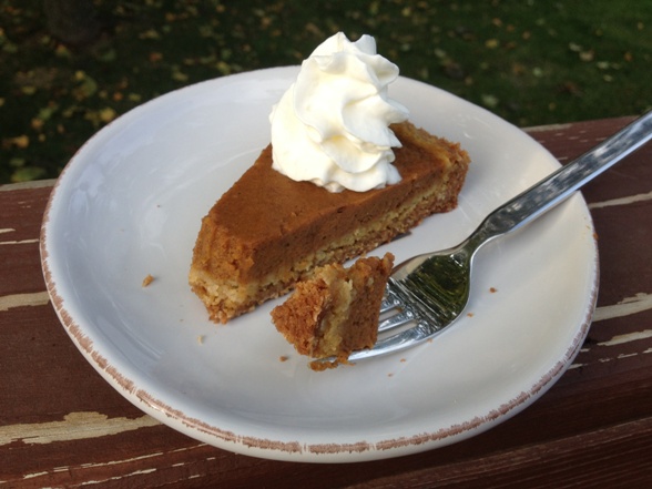 However, this tart has a much better filling to crust ratio and since the crust is actually oatmeal cookie it has a nice chewy texture, too. (Some people like chocolate with their pumpkin and I can see where chocolate chips added to the oatmeal cookie dough might be a nice addition, also.)Ice cream would be good, too!I made a very basic oatmeal cookie dough and pressed it into and slightly up the sides of a 10″ spring form pan. Pre-baking the crust for a few minutes makes the cookie dough set up a bit and forms a little ridge around the sides to hold the filling in. Be careful when you pour the filling in to the crust and it will stay within the perimeter of the crust.Mmmmm. . . .Let it cool (I cooled mine overnight), pop it out of the springform pan and serve it up. I’m telling you it’s good. You should make it. And now I can’t stop thinking of adding chocolate chips to the crust.A fall beagleLet me leave you with a little glimpse of the elusive Autumn beagle. She’s not allowed in my perennial flower bed in the summer but as it starts to die at the end of the season, we take down the decorative/beagle proof fence and she gets to trample it all she wants until we chop all the plants down. She has made herself right at home and this is where I found her one sunny day last week. Too cute.