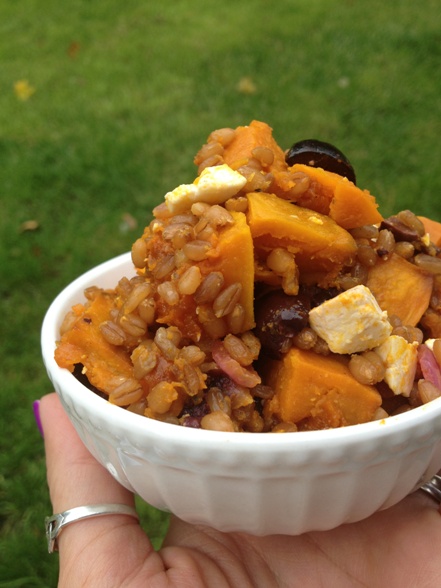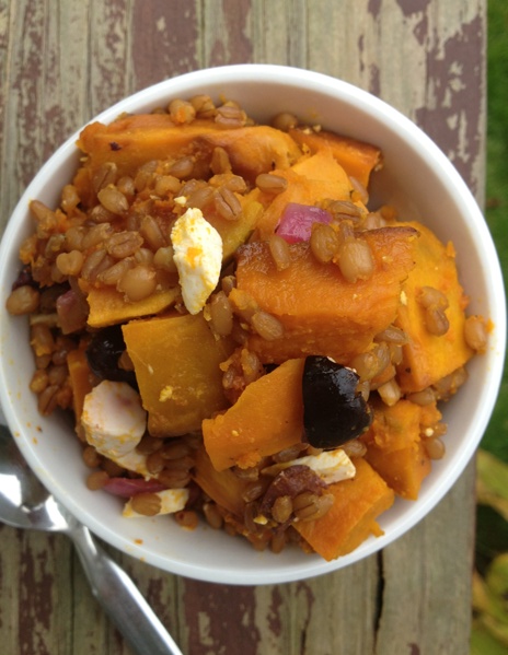 Grains like these wheat berries are so satisfying. Chewy and dense and filling. I love them. I could eat the wheat berries alone but mix in a bit of feta and olive and onion and squash. . . .YUM!