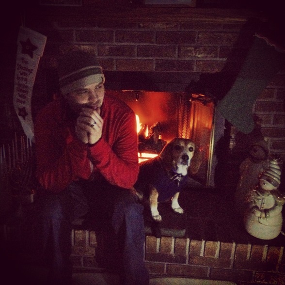 This is what happens when it gets that cold in the house. The dog (wearing a sweater) and the husband both have to snuggle by the gas fireplace. (Which, unfortunately, gives off very little heat.)