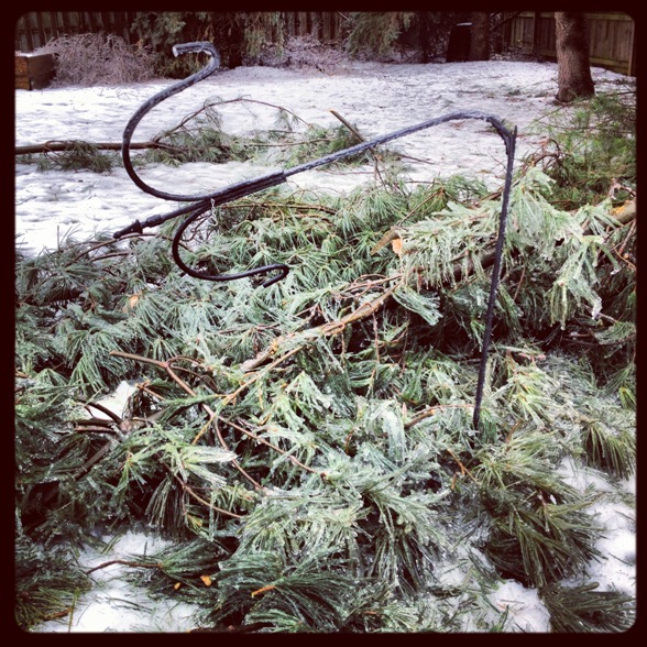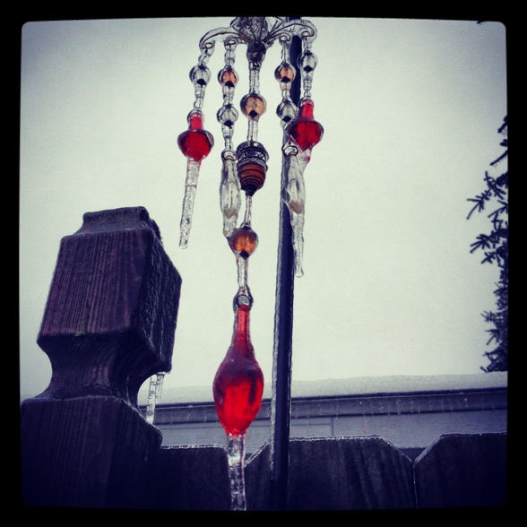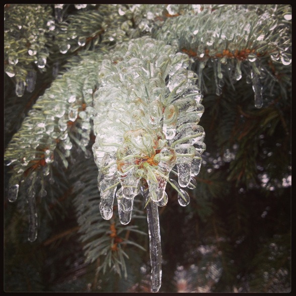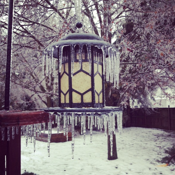 Saturday night (12/21/2013) an ice storm blew through our area & beyond covering everything in a thick, heavy coating of ice. Not only was it treacherous to be out in but by Sunday morning many trees and power lines had fallen thanks to the weight of the ice. That in turn knocked out power to a huge number of people including us and almost everyone we know.