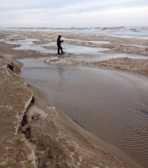 There is a lot of sand (of course, there are dunes) that blows around so at first we couldn’t even tell we were really on ice. The light sand dusting makes it hard to tell where the real sand ends and the sand dusted ice begins. Because it is (shockingly) warming up just a touch, open water is starting to appear at cracks in the ice. We managed to navigate safe ice for a bit and ended up over water that, from what we could tell, was roughly 4-5′ deep. It was fun, a little scary at times, and pretty cool to see that much ice covering such a huge lake.