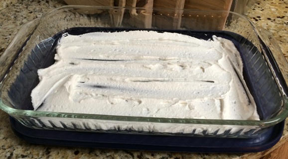 I had a few cookies leftover so I crushed them up in a Ziploc bag and sprinkled them on top the finished product. Cover the whole thing with plastic wrap and refrigerate overnight. A real crowd pleaser.