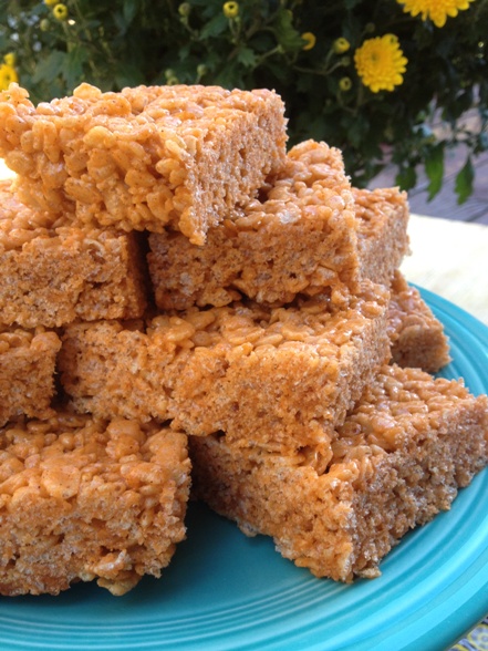 I’m continuing on with my October love affair with pumpkin spice. This also satisfies Tim’s love of marshmallow crispy treats.